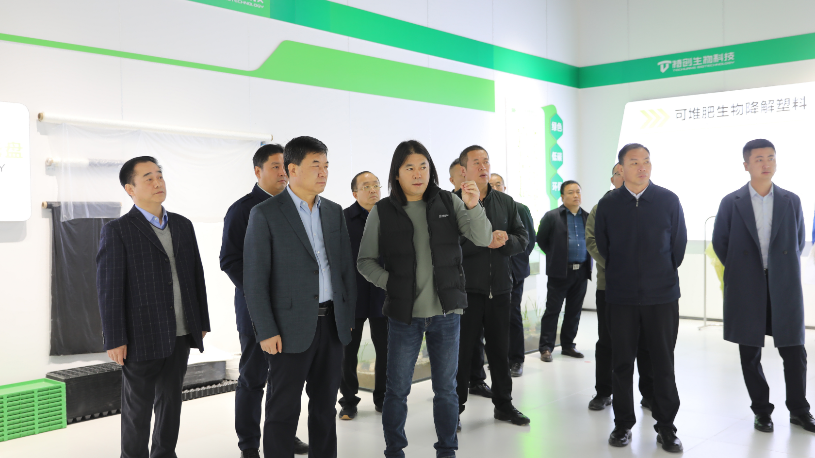 趙書記一行先后參觀了河南特創(chuàng)生物基可降解產(chǎn)業(yè)園產(chǎn)品展廳、研發(fā)中心,直觀了解了從原材料改性造粒、吹膜、印刷,再到公司生產(chǎn)的膜袋類、一次性餐具類、農(nóng)業(yè)類、紡織服裝類、醫(yī)療衛(wèi)生類等五大領(lǐng)域,八大系列產(chǎn)品,展示了全生物降解塑料的廣泛應(yīng)用領(lǐng)域,以及特創(chuàng)生物豐富的產(chǎn)品系列。參觀過程中,趙同慶書記詳細詢問了公司產(chǎn)品的設(shè)計理念、材料選用以及生產(chǎn)工藝等,并對公司在創(chuàng)新方面的努力給予了高度評價。