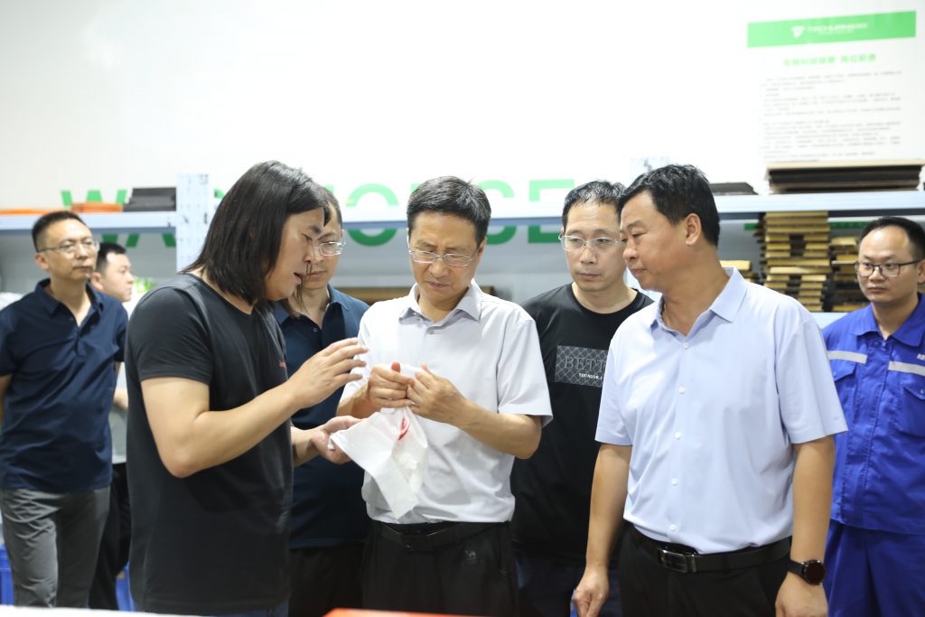 隨后,郜善軍一行又來到了河南特創(chuàng)現(xiàn)代化生產(chǎn)車間,近距離參觀了可降解制品的生產(chǎn)流程,并對(duì)公司高效的生產(chǎn)流程與嚴(yán)格的管理體系表示贊賞。郜善軍表示,在全省禁塑政策推動(dòng)下,河南特創(chuàng)應(yīng)把握機(jī)遇,提升產(chǎn)能,優(yōu)化產(chǎn)品,為禁塑工作提供有力支持。