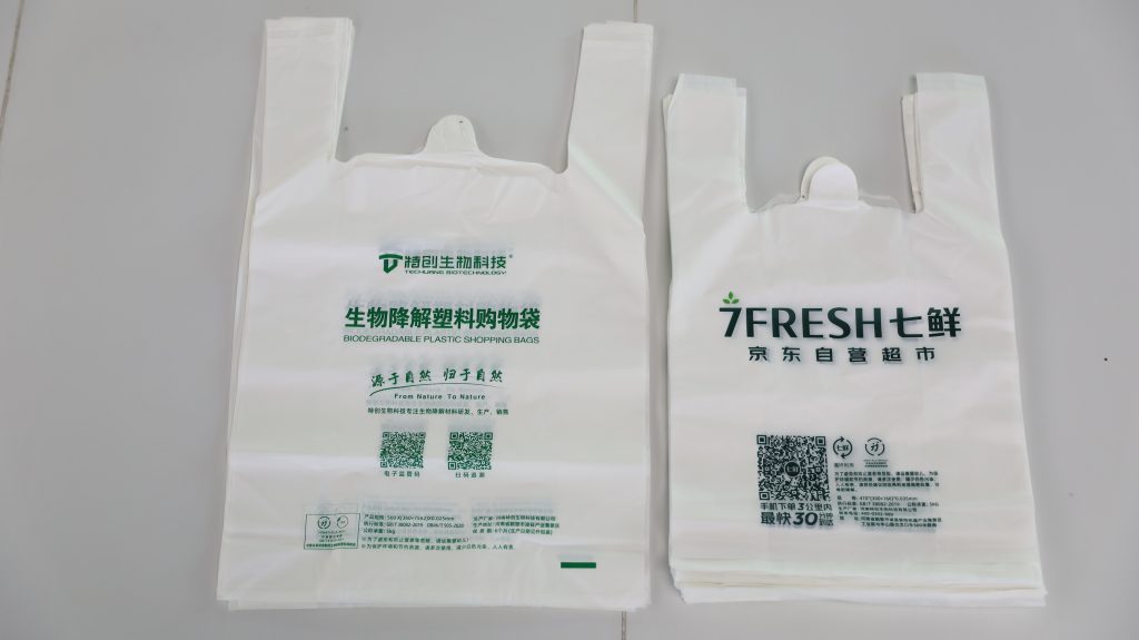 全生物降解購物袋:采用全生物降解材料,如聚乳酸(PLA)和聚己二酸(PBAT)。這些材料在特定的環(huán)境條件下,能夠自然分解為二氧化碳和水,對環(huán)境友好。